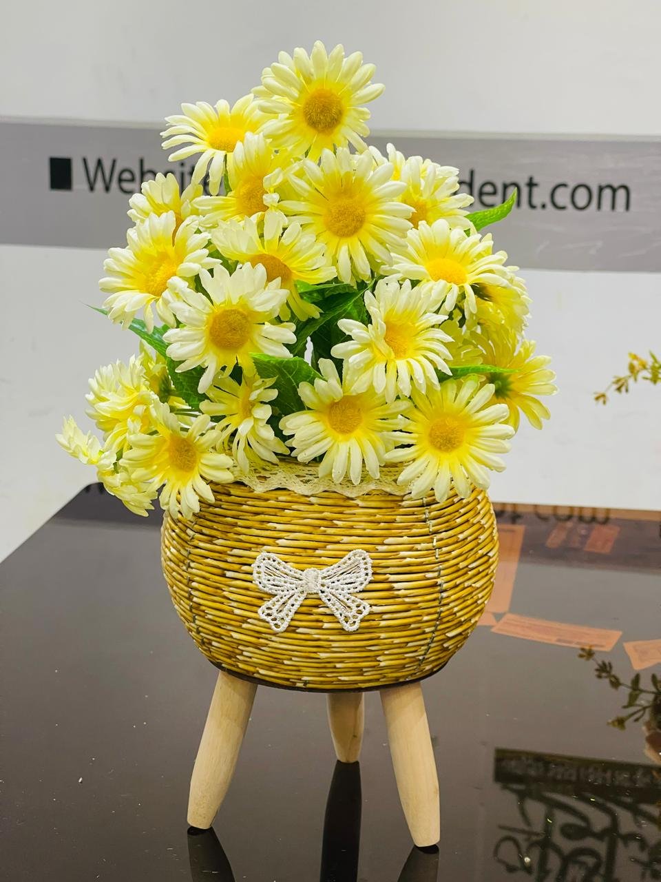 • ইউনিক প্ল্যান্টার ডিজাইন: এই পণ্যটির সবচেয়ে বড় আকর্ষণ এর ঝুড়িটি। এটি গোলাকার বেতের ঝুড়ি যা তিনটি ছোট কাঠের পায়ে (Wooden Legs) দাঁড়ানো। ঝুড়ির ওপরের অংশে সাদা লেইসের মতো বর্ডার এবং সামনে একটি কিউট ধনুকের নকশা (Bow Design) যোগ করা হয়েছে। * রঙ ও ফুল: এতে উজ্জ্বল হলুদ ডেজি ফুল ব্যবহার করা হয়েছে, যা আনন্দ এবং আশাবাদ ফুটিয়ে তোলে। ঝুড়িটি নিজেই হলুদ বা সোনালী রঙের, যা ফুলের রঙের সাথে মিশে এটিকে একটি মনোমুগ্ধকর লুক দিয়েছে।