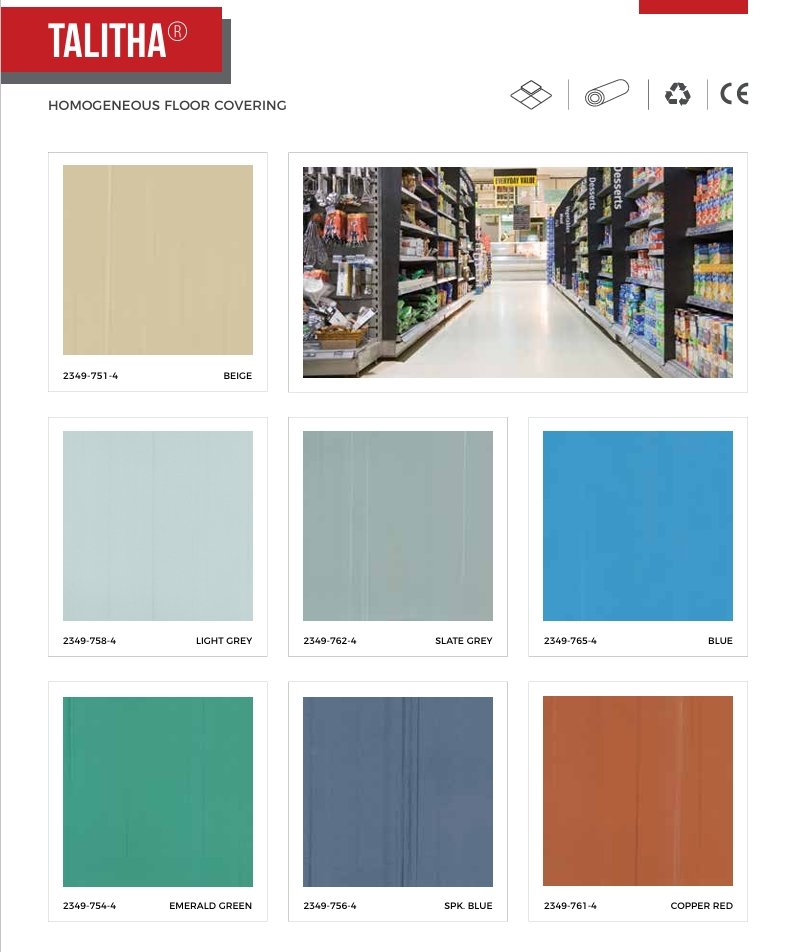 এটি একটি দিকনির্দেশক সমসত্ত্ব ফ্লোর কভারিং যা EN 649 অনুযায়ী Group P-তে স্থান পেয়েছে। এর পুরুত্ব 2.0 mm এবং এটি PUR Treatment দ্বারা সুরক্ষিত, যা রক্ষণাবেক্ষণ সহজ করে। এটি উচ্চ ট্র্যাফিক (Usage Class 34/43) এবং কাস্টর চেয়ার পরীক্ষার (EN 425) জন্য উপযুক্ত। অ্যাট্রিবিউট: Color: Copper Red, Thickness: 2.0 mm, Slip Resistance: R9 (DIN 51130)।